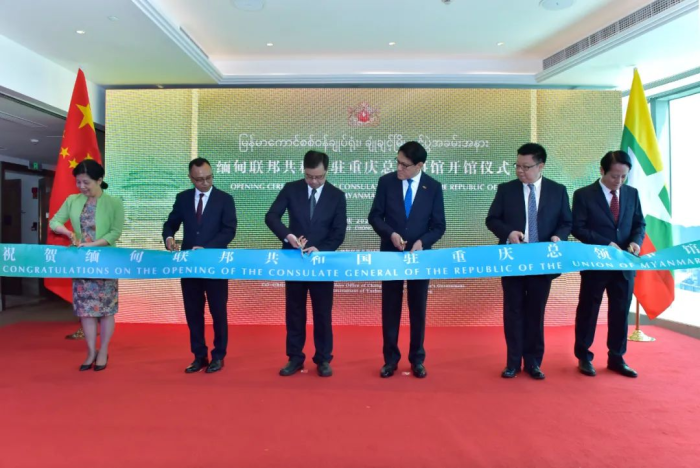 7月12日,缅甸驻重庆总领事馆在解放碑环球金融中心正式开馆。这是继昆明、南宁之后,缅甸在我国内地设立的第三家总领事馆。副市长但彦铮,缅甸驻华大使苗丹佩,缅甸驻重庆总领事吕真才,缅甸驻华大使馆公使衔参赞杜欣玛泰,中国外交部领事司副司长魏晓东,市政府外办主任王雯,湖北省委外办主任章笑梅,市文化旅游委主任刘旗,渝中区委书记赵世庆,璧山区委书记秦文敏,渝中区委副书记、区长黄茂军,璧山区委副书记、区长江志斌,市商务委一级巡视员宋刚,渝中区委副书记张远洪出席开馆仪式。