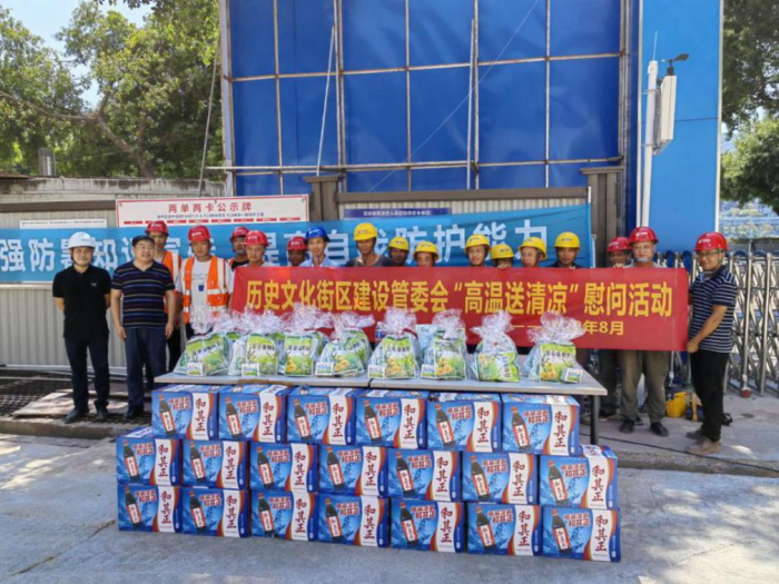 近日,我区持续晴热高温,管委会辖区各项目施工单位仍冒着酷暑错峰施工,许多工人仍坚守在施工现场一线。根据区委、区政府关于加强高温灾害风险防范应对、严格落实防暑降温措施、强化高温安全保障等工作要求,历史文化街区管委会组成慰问小组,到辖区内各重点施工建设项目、一线执法现场开展“高温送清凉”走访慰问活动,送去清凉礼包近200份。