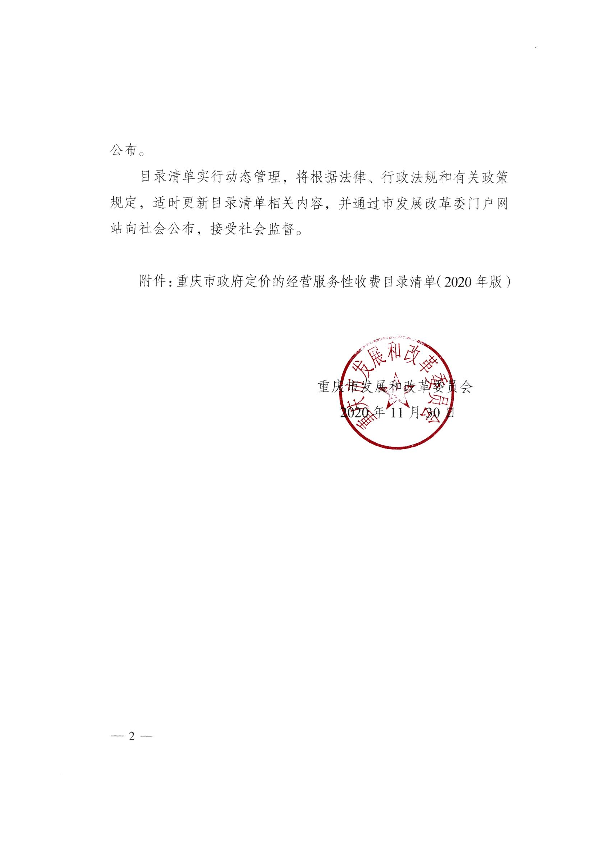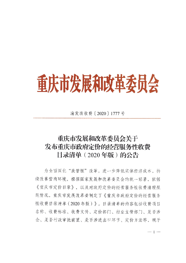 《重庆市发展和改革委员会关于发布重庆市政府定价的经营服务性收费目录清单(2020年版)的公告》(渝发改收费〔2020〕1777号)