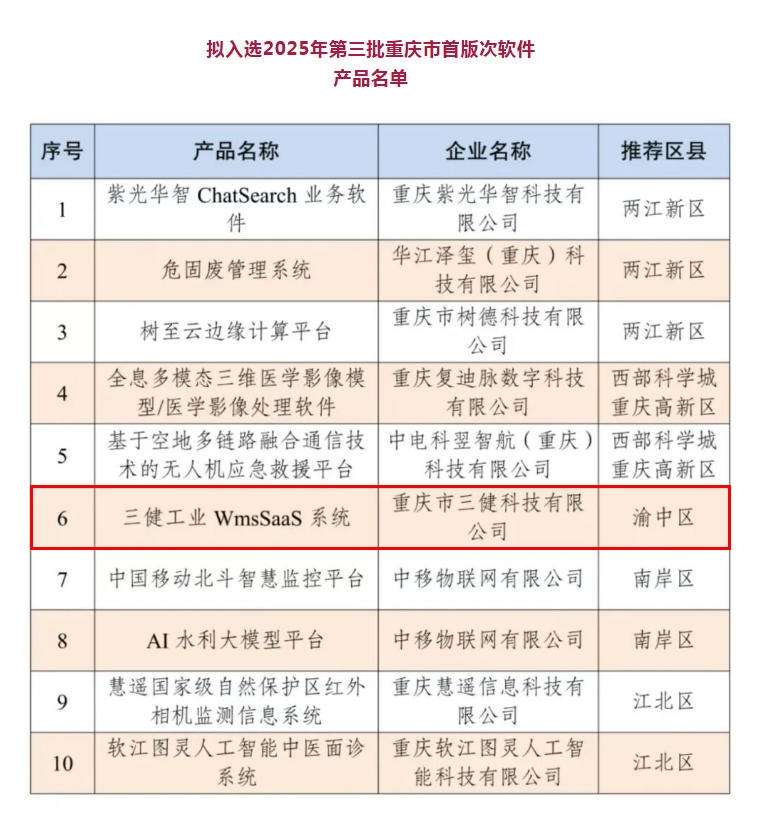 记者从名单上看到,由重庆市三健科技有限公司打造的三健工业WmsSaaS系统,精准聚焦制造业与工业物流领域,深度洞察行业痛点,针对工业仓储环节中普遍存在的“精准度不足、合规性弱、协同效率低”等核心问题,提供全面且高效的解决方案。产品覆盖范围广泛,适用于多个细分行业,满足不同行业对仓储管理的多样化需求。