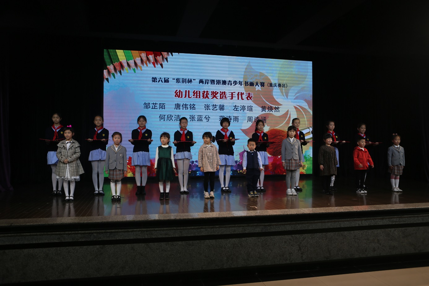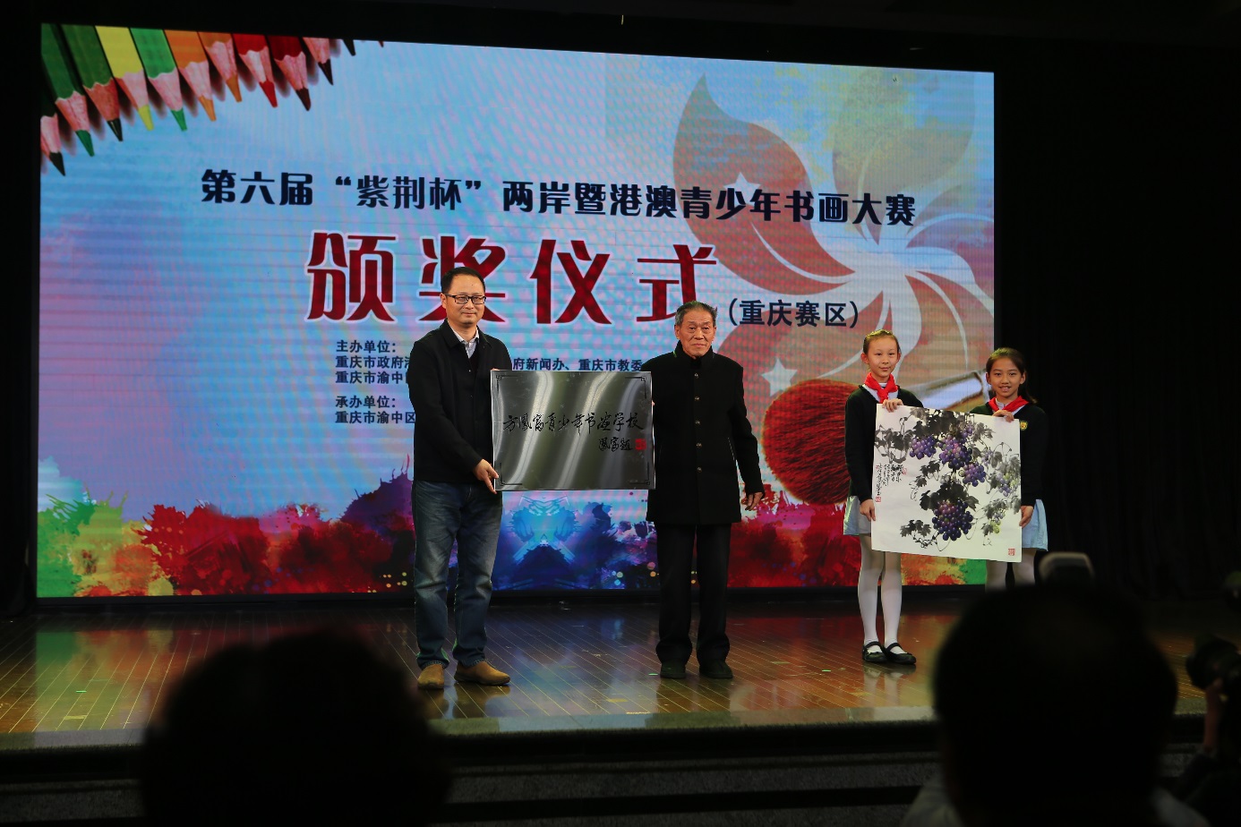 10月30日,第六届“紫荆杯”两岸暨港澳青少年书画大赛(重庆赛区)颁奖仪式在重庆市人民小学举行。本届“紫荆杯”两岸暨港澳青少年书画大赛由重庆市政府港澳办、重庆市政府新闻办、重庆市教委、重庆市文联、香港紫荆杂志社等单位主办,重庆市人民小学教育集团作为承办单位之一,承担了重庆赛区的初选、初评、终审及举办颁奖仪式等多项工作。