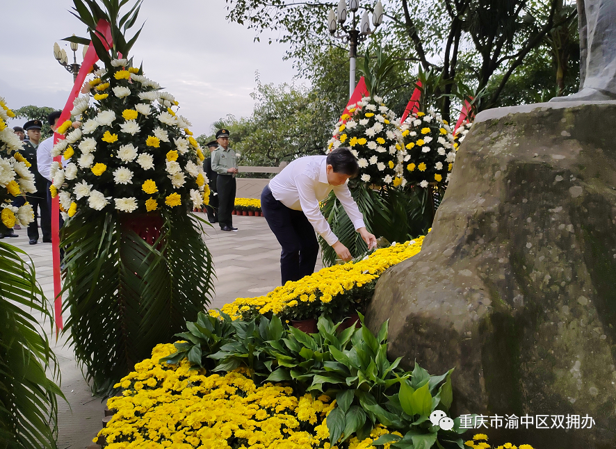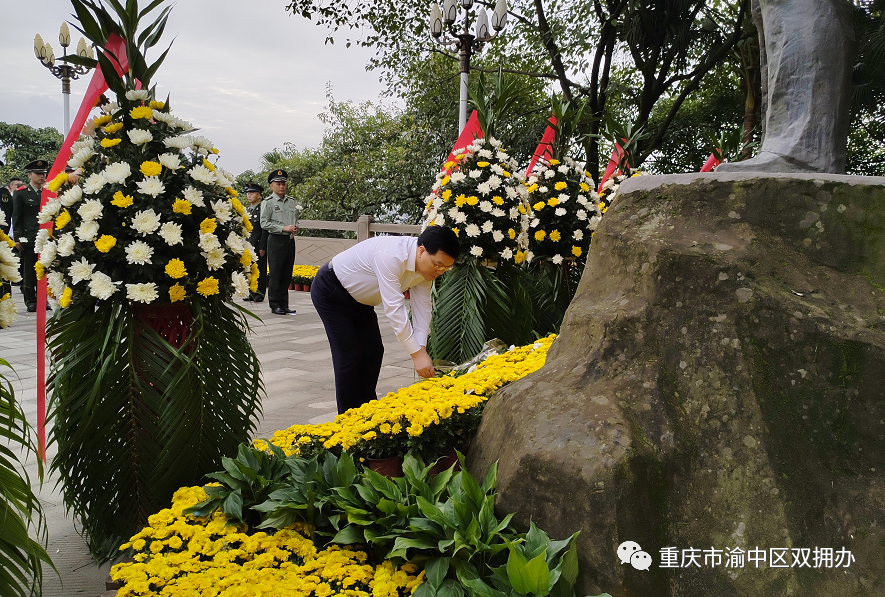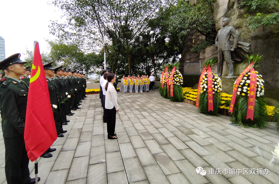 杨闇公烈士纪念铜像前,以中共渝中区委,渝中区人大常委会,渝中区人民政府,渝中区政协,驻区解放军和武警部队,渝中区各民主党派、区工商联和无党派人士,渝中区各人民团体、各界群众,渝中区老战士、老同志和烈士亲属,渝中区少先队员名义敬献的9个花篮一字排开,红色缎带上写着“烈士永垂不朽”金色大字。