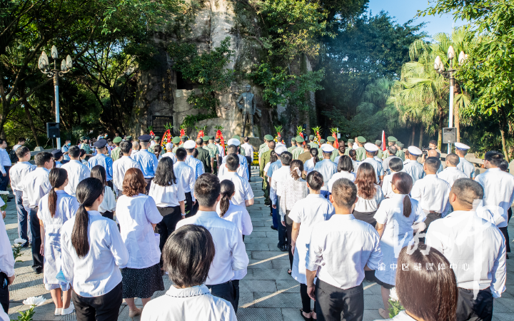 在庄严肃穆的气氛中,全体人员肃立、脱帽,向为中国人民解放事业和共和国建设事业英勇献身的烈士默哀。
