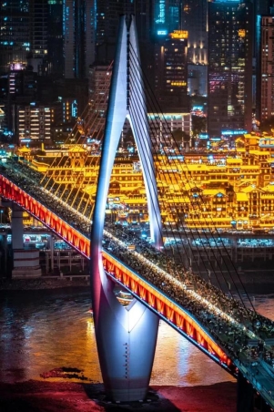 人潮涌动的千厮门大桥与熠熠生辉的洪崖洞交相辉