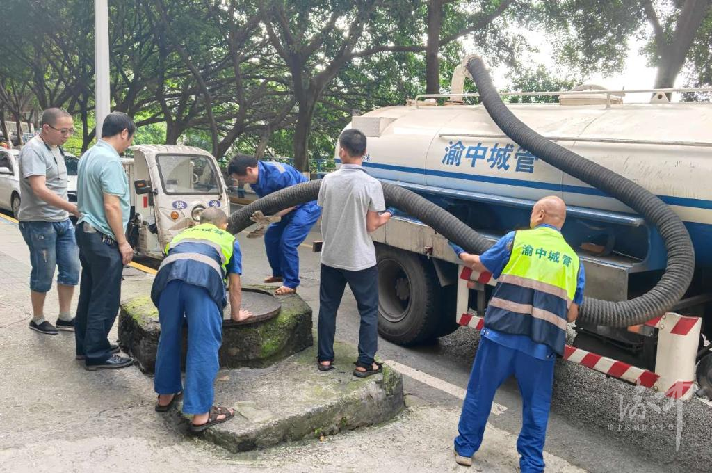 渝中区城市无害化管理中心派出吸粪车对堵塞的污水管网和化粪池进行疏通。