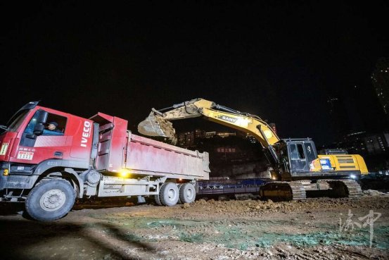 重庆站铁路枢纽及配套工程项目,挖机和渣土车在夜间协同施工作业。