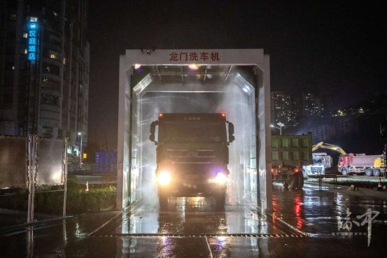 夜间作业的渣土车经过洗车机。