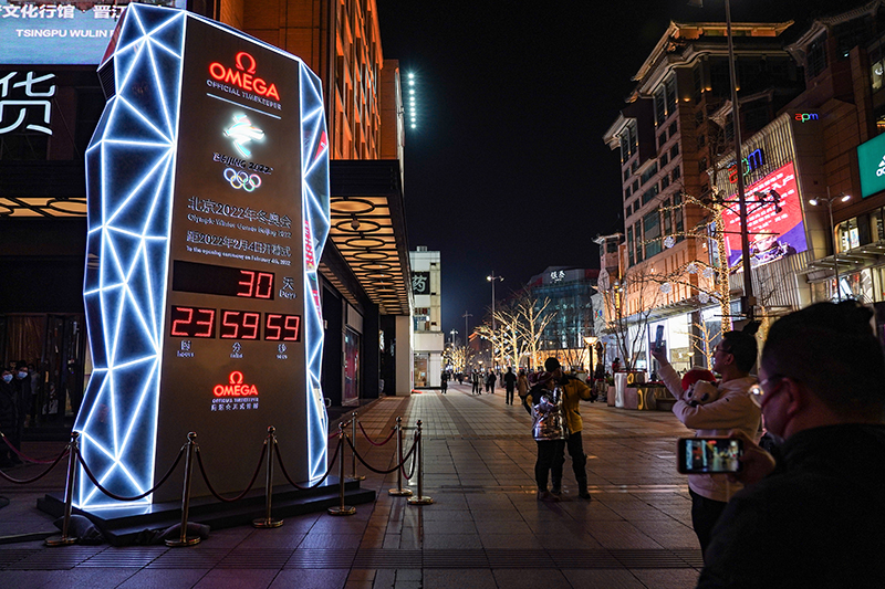 1月4日,人们在北京王府井大街的北京2022年冬奥会倒计时牌前拍照。