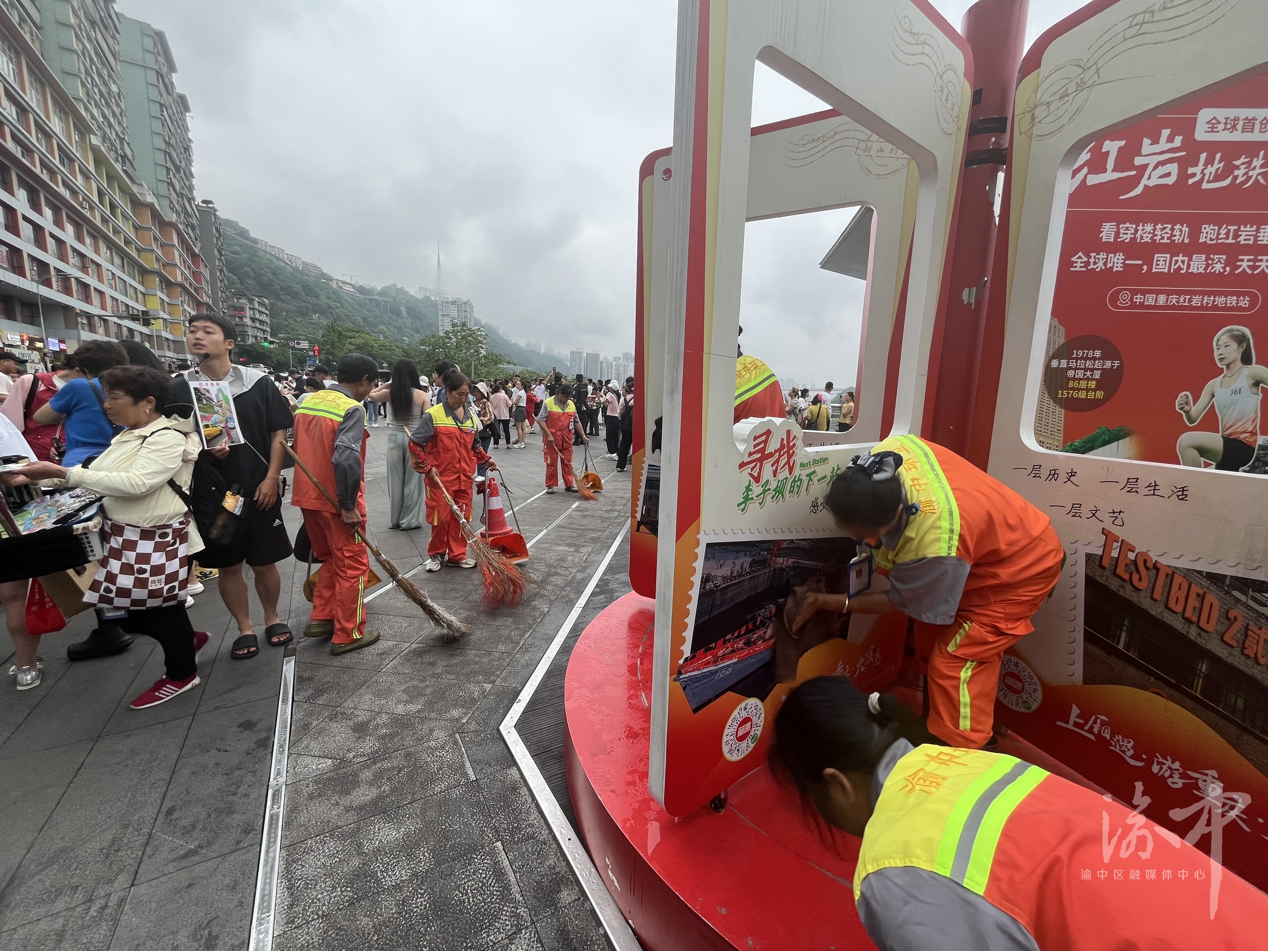 环卫工人杨德凤告诉记者:“假期开始后,李子坝观景平台实施‘动态保洁’机制,20余名环卫工人轮班作业,重点区域每15分钟巡回清理一次,每天市民、游客多晚走,我们就多晚下班。”