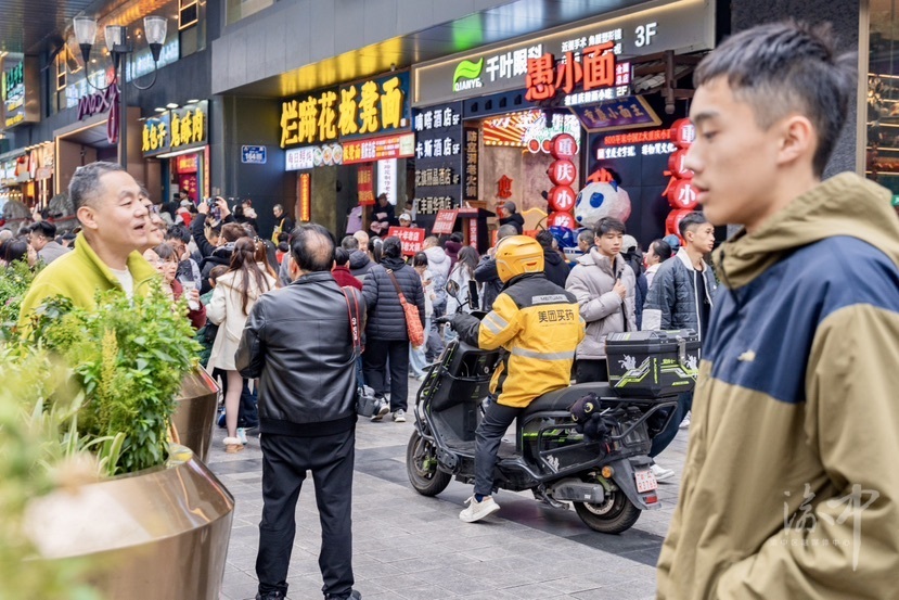 八一路好吃街,外卖骑手骑车穿行在步行街上,存在安全隐患。