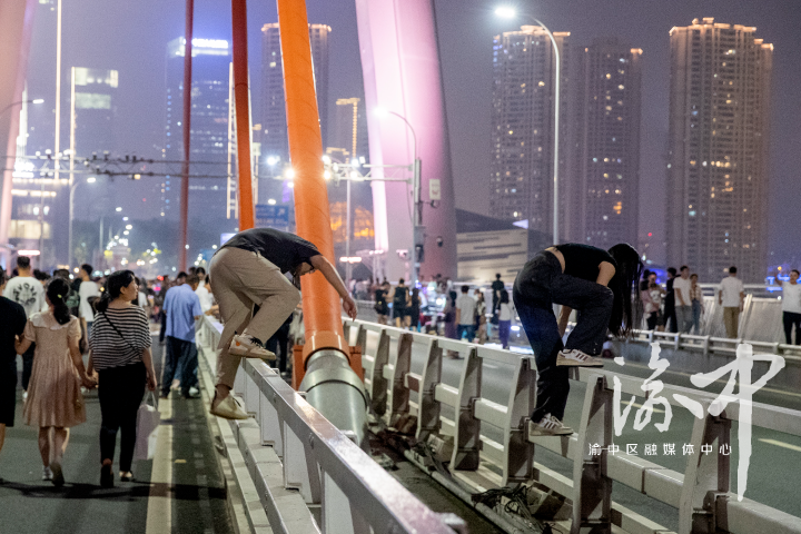 千厮门大桥上,游客翻越大桥栏杆。