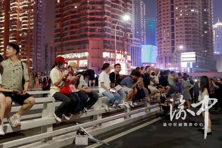 游客坐在千厮门大桥栏杆上休息、拍照。