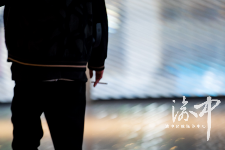 解放碑,游客手拿点燃的香烟出入商场。