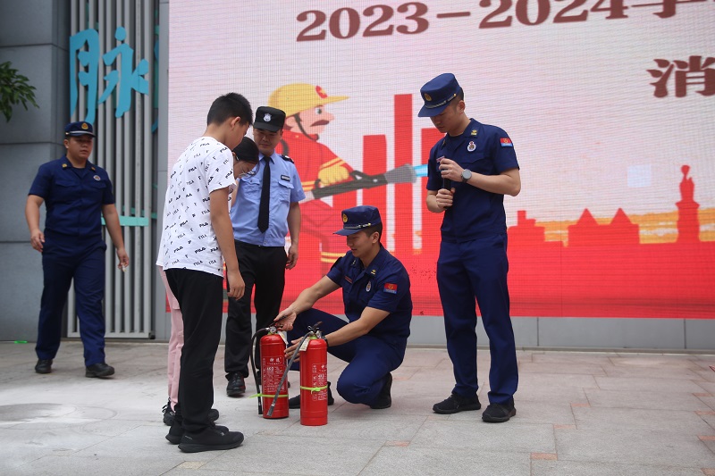 随后,较场口消防救援站的消防员们现场展示了消防器材的使用方法,包括灭火器的实际操作演示、消防栓的快速连接与出水等关键技能。在互动环节中,学生们在消防员的协助下,亲身体验了使用灭火器扑灭模拟火源的过程,切身感受了灭火的重要性,激发了他们学习消防知识的兴趣。