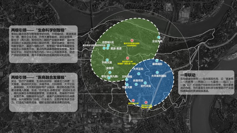 积极融入全市“33618”现代制造业集群体系和“416”科技创新布局,突出放大“重庆医科大学”和“重庆信息与智慧医学研究院”两个极核作用,围绕布局“基础研究—概念验证—成果转化一产业集聚”的高能级成果转化平台,以及服务产业集聚和消费医疗的公共服务平台,聚焦“两极一带”(生命科学创智极、医商融合发展极和生命健康协同带)空间布局,打造具有全国影响力的医学创新策源与产业转化高地。