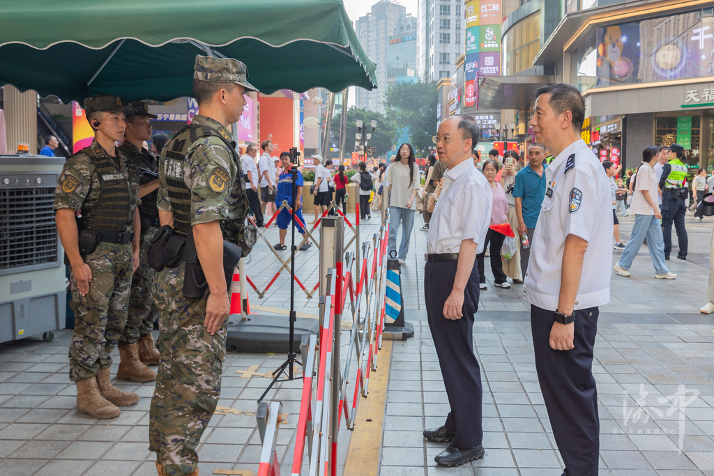 在解放碑步行街,武警、特警、交巡警“三警联勤巡防”,托起市民、游客“稳稳的安全感”。黄茂军同大家握手交谈,感谢大家为守护城市安宁作出的贡献。黄茂军指出,解放碑是重庆地标、城市“窗口”,要进一步抓好警种联动,突出警种协作、警务互补、警力集约,抓好风险防控和应急处突,提高街面见警率、管事率,提升群众安全感、满意度。