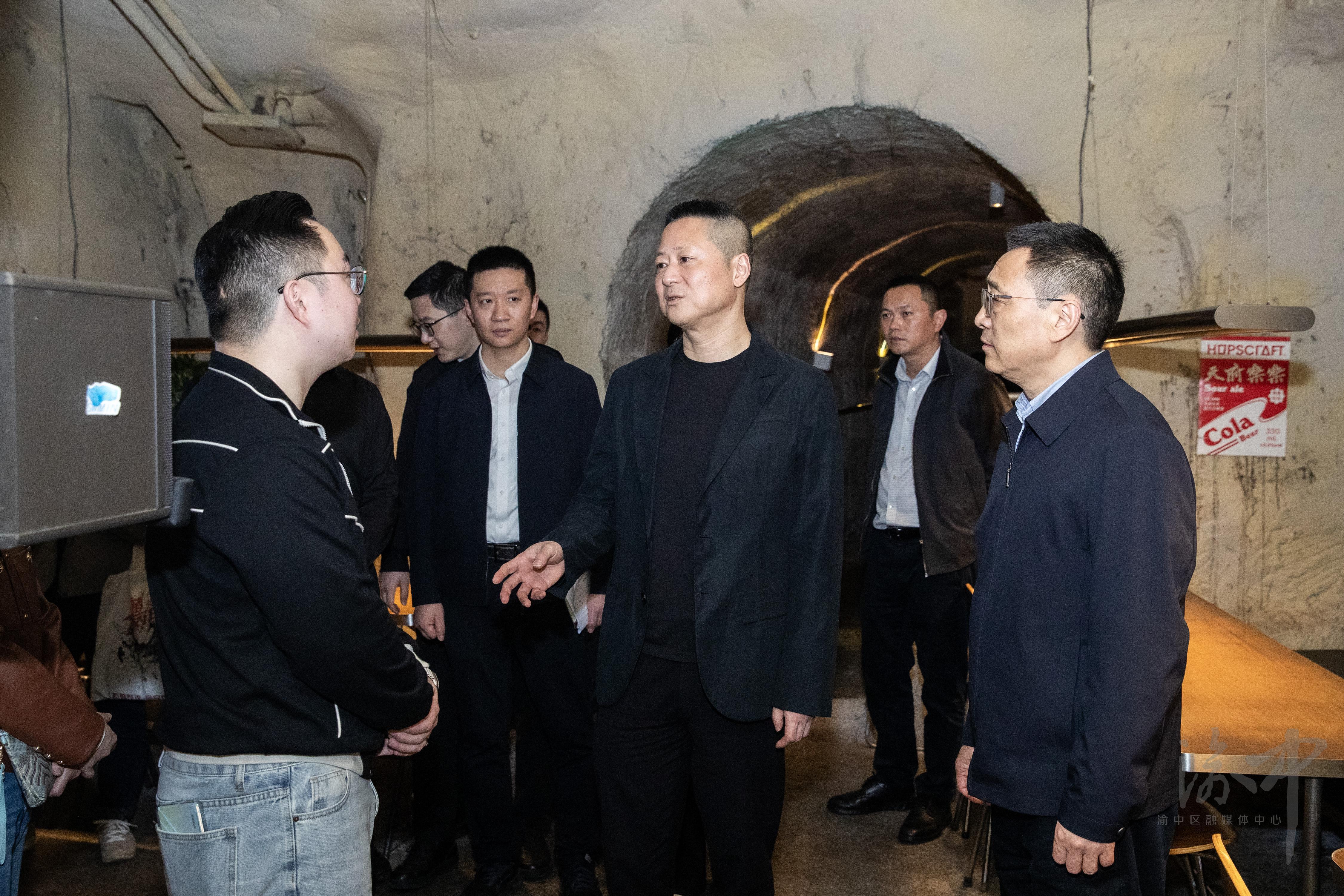 渝中区委书记、区长谢东在CAVER防空洞酒吧调研品质消费场景打造工作。