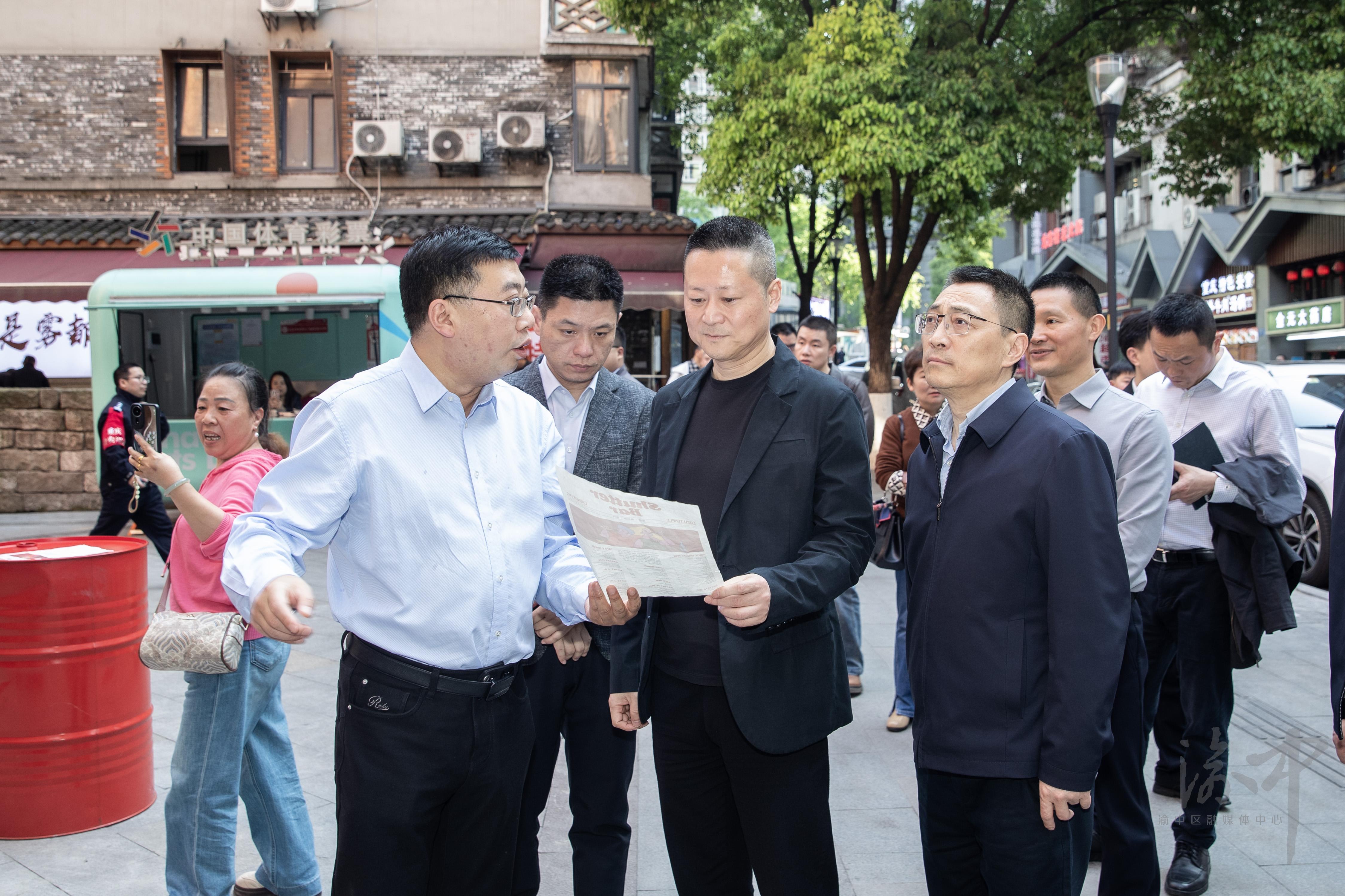渝中区委书记、区长谢东在鲁祖庙传统风貌区调研国际品质消费工作。