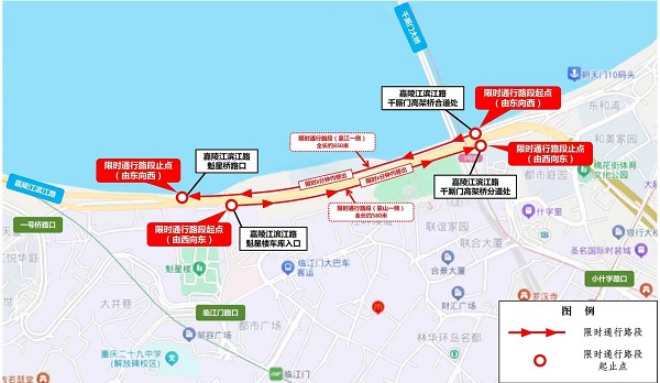 为持续优化嘉陵江滨江路洪崖洞路段交通组织,缓解重点路段通行压力,保障市民及游客出行安全便捷,根据《中华人民共和国道路交通安全法》及相关法律法规规定,结合该区域交通流量变化、道路资源现状及群众出行需求,决定在嘉陵江滨江路洪崖洞特定路段实施限时通行管理。该限时通行路段由东向西自嘉陵江滨江路(靠江一侧)千厮门高架桥合道处起至嘉陵江滨江路魁星桥路口止,为单向约650米路段;由西向东自嘉陵江滨江路(靠山一侧)魁星楼车库入口起至嘉陵江滨江路千厮门高架桥分道处止,为单向约580米路段。现将有关事项通告如下: