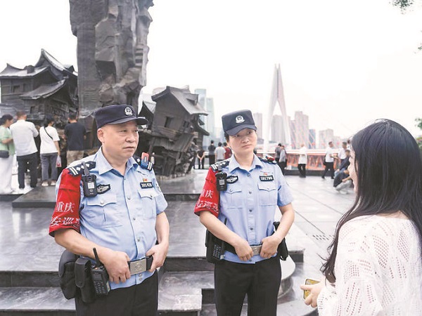 10月1日早,薄雾刚散,重庆市公安局渝中区分局朝天门街面警务大队民警辅警便在洪崖洞11层的观景台入口等待游客到来。