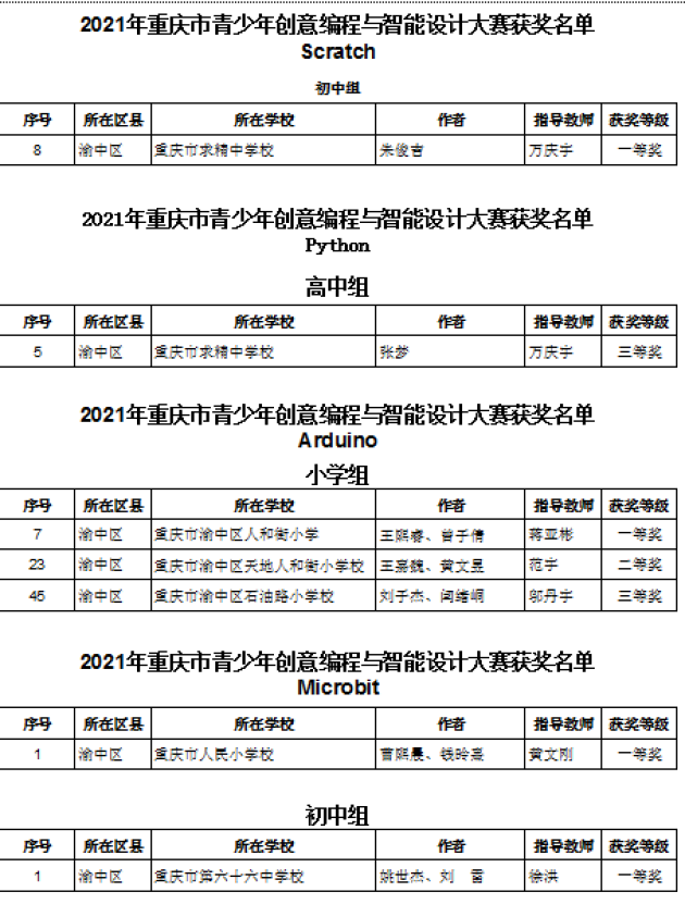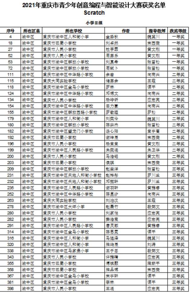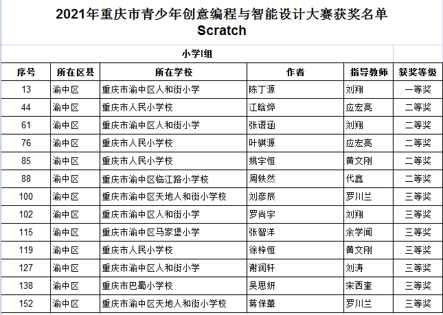 3月21日,由重庆市科协、市教委、市大数据应用发展管理局共同举办的2021年重庆市青少年创意编程与智能设计大赛决赛终评结果公布,渝中区代表队共有求精中学、六十六中学、巴蜀小学、人和街小学、人民小学等15所中小学校的93件作品入围本次大赛决赛。通过网上评审、初评、决赛终评,共获得11个一等奖、20个二等奖、30个三等奖。较往年相比,渝中区的参赛作品不仅在数量上创下新高,科技创新“含金量”也明显提升。