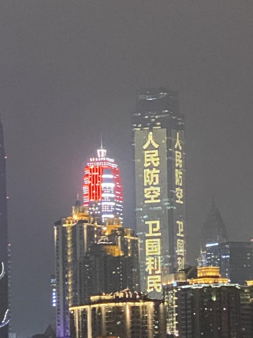 为营造浓厚的节日氛围,10月30-31日,在渝中区地标建筑WFC刊发庆祝新中国人民防空创立70周年公益广告,上演主题灯光秀。“人民防空是国之大事,是国家战略,是长期战略”“人民防空,卫国利民”等巨型字幕滚动播放,吸引人们驻足观看,与江北区、南岸区灯光秀一起向新中国人民防空创立70周年献礼。