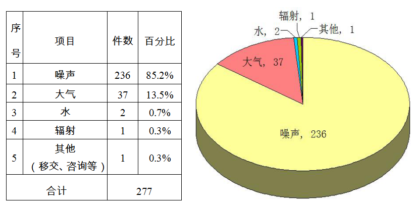 本月受理277件污染投诉中,噪声污染投诉量居首位,共236件,占85.2%(其中建筑施工噪声投诉212件,占噪声污染投诉总量89.8%);大气污染投诉量列第二,共37件,占13.5%(其中油烟污染投诉30件,占大气污染投诉总量81.1%)。