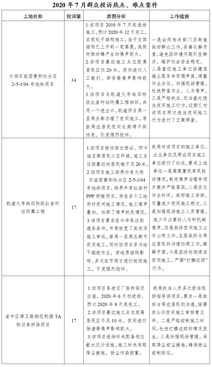1.夜间建筑施工噪声扰民仍为投诉热点。