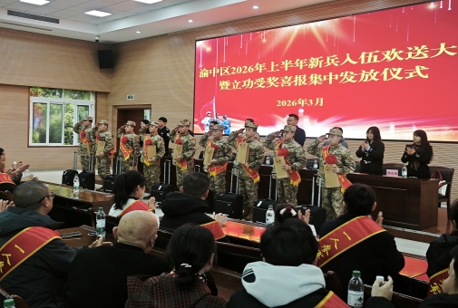 此次活动将送新兵、颁喜报有机结合,既是一次庄重的入伍壮行,也是一场润物无声的国防教育与双拥实践,进一步营造了“一人当兵、全家光荣”“一人立功、全家光荣 ”的浓厚社会氛围,激励更多渝中青年踊跃应征、从戎报国。近年来,渝中区持续完善“入伍有激励、在伍有保障、退伍有服务”全链条政策体系,军地协同推出一系列征兵优待举措,在帮扶援助、就业安置、创业扶持等方面持续发力,不断提升军人军属荣誉感、获得感,全力以赴让前线军人安心、后方军属暖心。