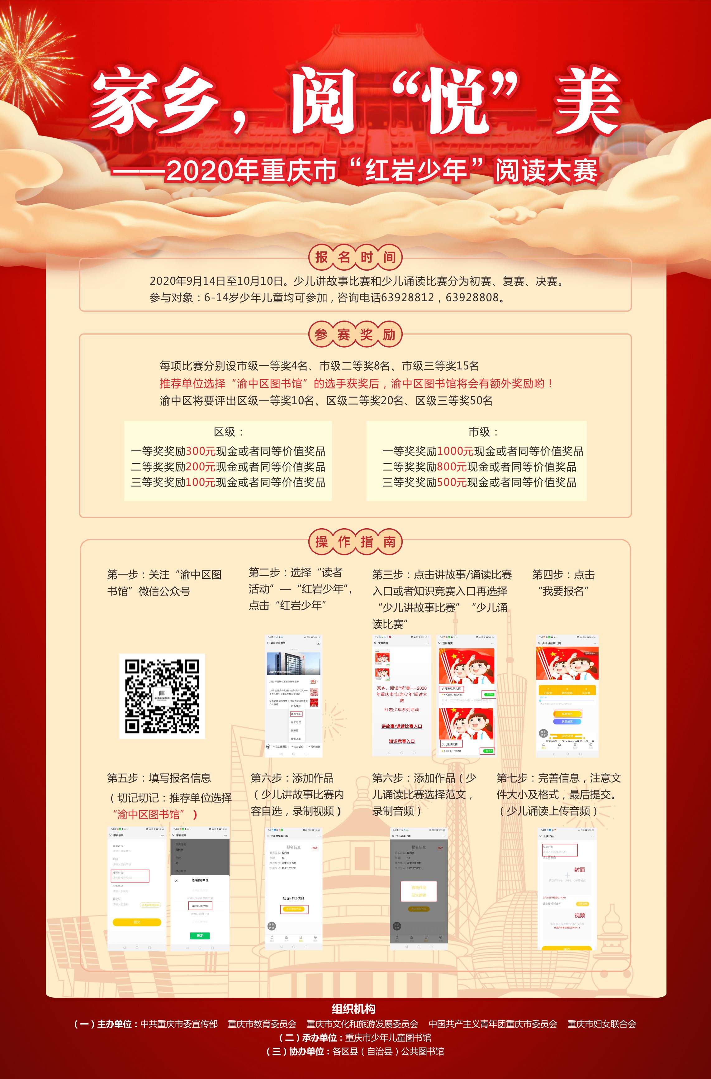 本次活动面向全市6至14岁少年儿童,大赛初赛从9月14日至10月10日,小读者可通过关注区图书馆微信公众号,上传自己的音/视频作品参赛。本次活动设有市级、区级不同的奖项与奖励,活动复赛与决赛将于10月——11月进行。