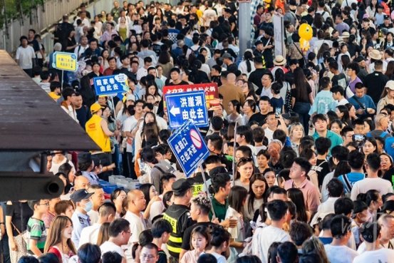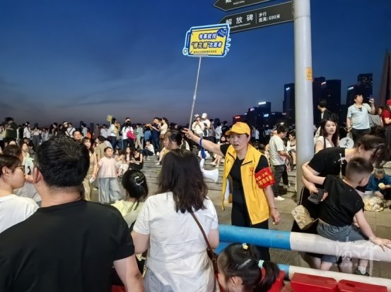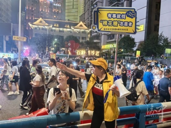 “五一”期间,每天下午5点至11点,在洪崖洞行色匆匆的人流中,身着黄马甲、佩戴红袖标、高举“有事找‘棉花糖’志愿者”“千厮门由此去”等牌子的人格外醒目。他们活跃在人群中,不时为游客提供道路问询、分流指引等服务。