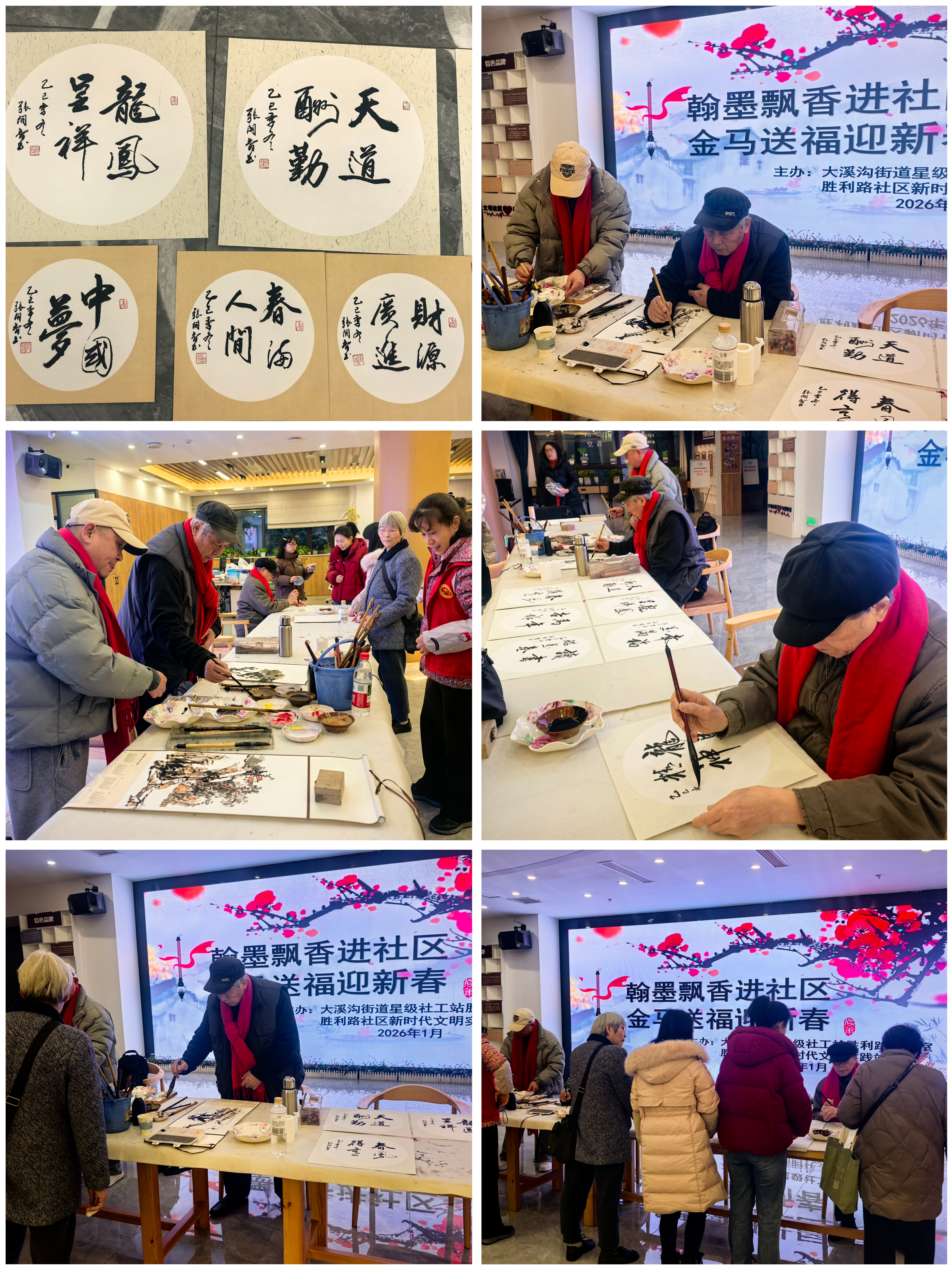 为弘扬中华优秀传统文化、营造喜庆祥和的节日氛围。1月23日下午,大溪沟街道星级社工站联合胜利路社工室举办了“翰墨飘香进社区 金马送福迎新春” 主题活动。活动现场墨香四溢,渝中开明画院等多位书画家齐聚一堂,现场挥毫泼墨,一幅幅充满新春祝福的春联和寓意吉祥的画作跃然纸上。居民们围绕在书画家身边,欣赏创作过程,感受笔墨丹青的魅力。本次活动既传递了温暖诚挚的新春祝福,也丰富了居民的精神文化生活,进一步营造了和谐友爱的社区氛围。