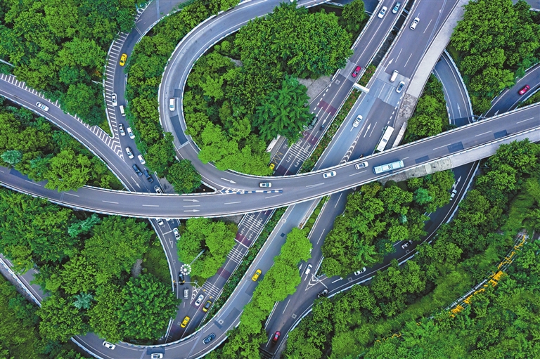 雨后的石板坡立交蜿蜒盘旋在一片绿地之上 形成一道美丽的风景线