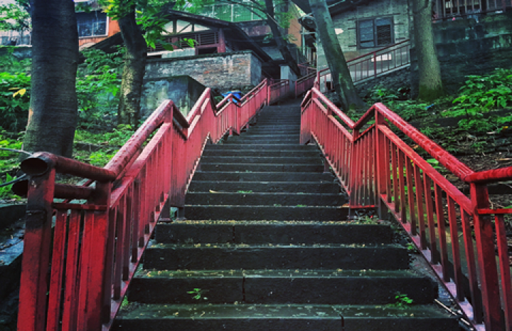 距离李子坝轻轨站不远处便是三层马路的入口,循着幽静的三层马路层层而上,保留至今的史迪威将军博物馆、重庆谈判旧址群、中国农工民主党中央机关旧址、国民政府军事参议院、财政部金库、交通银行学校、美国驻华大使馆俱乐部、飞虎队队员宿舍,以及孙科公馆、刘湘公馆、李根固公馆、吴铁城官邸、高显鉴公馆等都座落于此,鳞次栉比,可以让你寻觅到二战的足迹。从三层马路爬至山顶,就是鹅岭印制二厂旧址。这里地势较高,可以俯瞰渝中半岛,等到夜幕降临,华灯初上,万家灯火闪烁,渝中半岛仿若一片星辰,熠熠生辉。