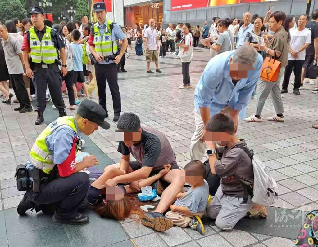 10月3日上午10时,解放碑商圈正值客流高峰,解放碑街面警务大队民警在巡逻时,发现一名女子倒地,口中不断涌出白沫,情况十分危急。民警立刻冲上前,一边协助身旁惊慌失措的家属开展救助,一边快速了解情况。