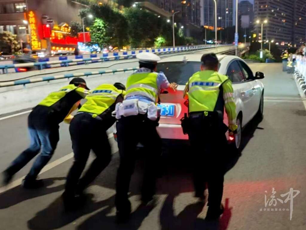 国庆中秋假期,洪崖洞游客络绎不绝,交通压力也随之增大。10月2日晚8时许,一辆轿车行驶至洪崖洞附近突然抛锚,停在路中间无法移动。朝天门大队执勤民警发现该情况,立刻带领骁骑队员上前帮忙徒手推车至路边不影响交通的区域,及时排除路面拥堵。原本焦急的车主心情逐渐平静下来,看着满头大汗的民警,感动得不停道谢。
