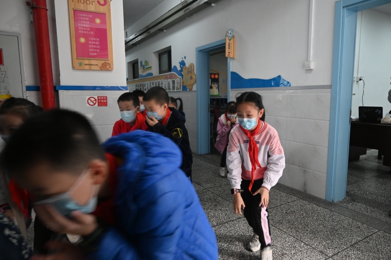演练假设:教学楼三楼音乐教室因线路故障发生“火灾”,现场烟雾弥漫,楼内约有近600余名学生正在上课。随着一阵刺耳的警报声,疏散演练正式开始。学校在第一时间启动应急疏散预案,各班学生在老师的指挥下,利用口罩、毛巾、衣服等捂住嘴和鼻子,以半蹲姿势迅速从疏散楼梯撤离到操场上的指定安全地点集合。同时,学校监控室的值班人员立即拨打“119”火警电话报警。渝中区小什字消防救援站接到任务后立即赶赴现场进行处置。整个演练过程行动迅速而有秩序,经过1分45秒,师生全部安全撤离,8分25秒,消防员处置完火场,演练结束。