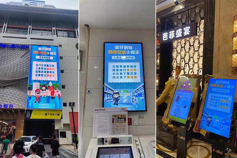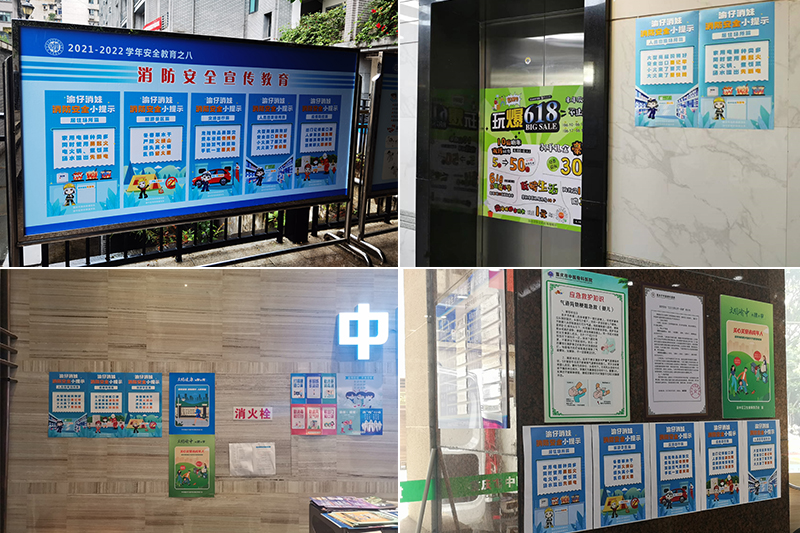 此次消防宣传海报内容丰富、针对性强,贴近人民群众日常生活,涵盖居住场所、旅游景区、交通出行、人员密集、疫情防控等内容。渝中消防积极发动辖区街道、社区及重点单位在各场所的出入口、走廊楼道、电梯轿厢、宣传公示栏等醒目位置大力张贴,广泛提醒和呼吁居民群众关注消防,学习更多的消防安全知识,预防和遏制常见的消防安全陋习,防止火灾发生。此外,渝中消防还利用辖区写字楼、商场、市场等公共场所的LED电子屏幕循环滚动播放宣传海报。