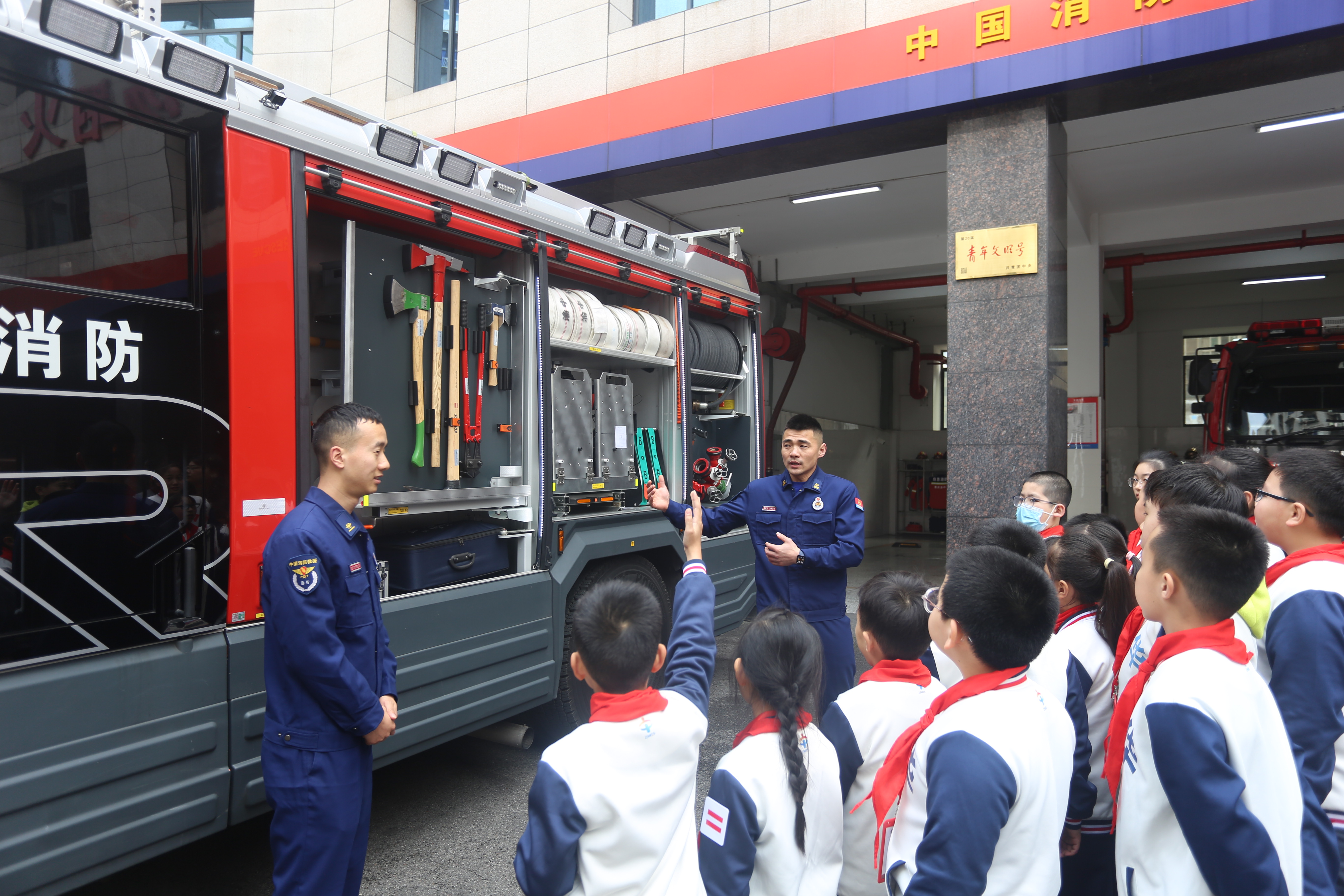 较场口消防救援站指战员用深入浅出、生动形象的语言为来队参观的同学们讲解消防执勤车辆的类型和用途,现场展示了火场防护装备、灭火器、救生器材的用途、性能和使用方法,并结合学校火灾的特点,与大家面对面分享遇到突发火情怎样正确拨打火警电话、如何疏散逃生等基本消防安全知识。