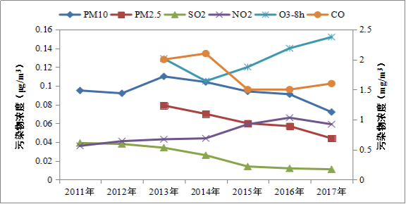 环境空气质量Ⅱ级以上的天数比例逐年升高,除NO2、O3年均浓度有所上升以外,其他主要污染物浓度都有不同程度下降。2017年空气质量优良天数为271天,同比2013年增加79天,主要污染物PM2.5年均浓度较2013年下降44.3%,SO2、PM10年均浓度较2013年分别下降67.6%、34.5%,只有NO2年均浓度和O3-8h浓度分别较2013年上升37.2%和17.8%,空气质量总体上呈稳步改善趋势。