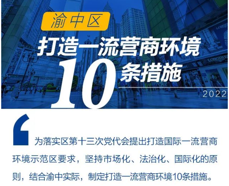 为落实区第十三次党代会提出打造国际一流营商环境示范区要求,坚持市场化、法治化、国际化的原则,结合渝中实际,制定打造一流营商环境10条措施。