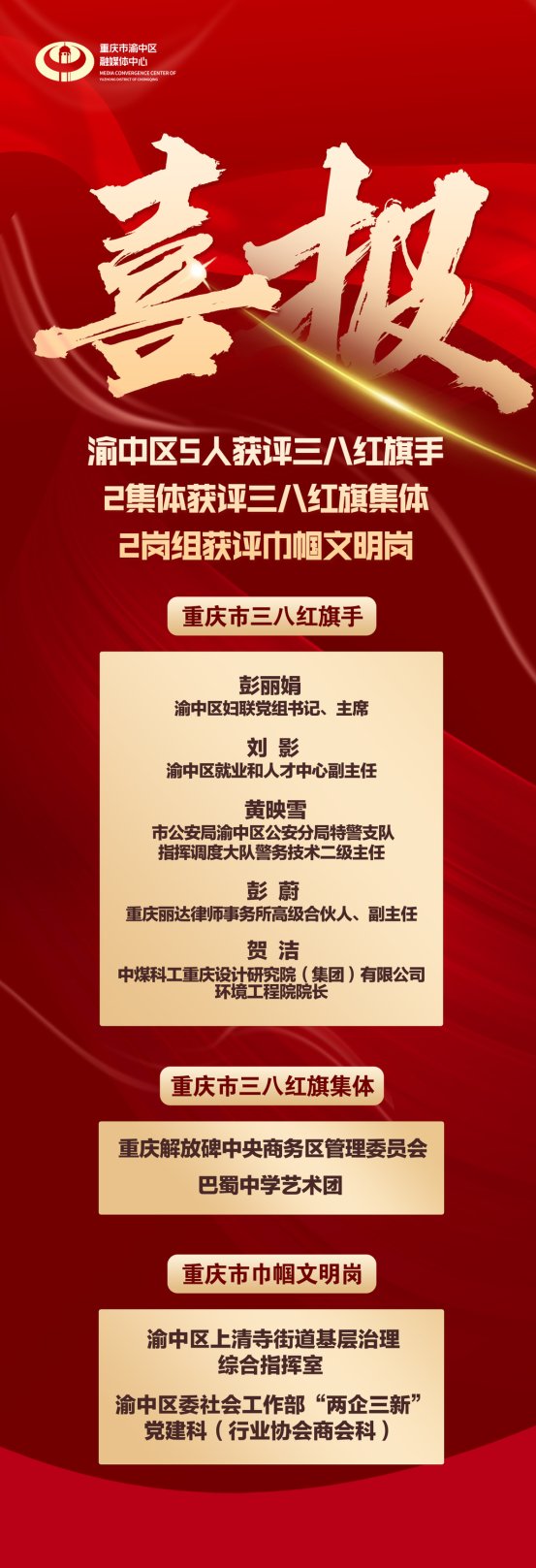 海报|渝中区5人获评三八红旗手 2集体获评三八红旗集体 2岗组获评巾帼文明岗